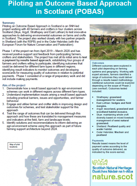 Piloting an Outcome Based Approach in Scotland is an SNH-led project working with 40 farmers and crofters in four clusters across Scotland (Skye, Argyll, Strathspey and East Lothian) to test innovative approaches to delivering environmental outcomes on farms and crofts in Scotland.