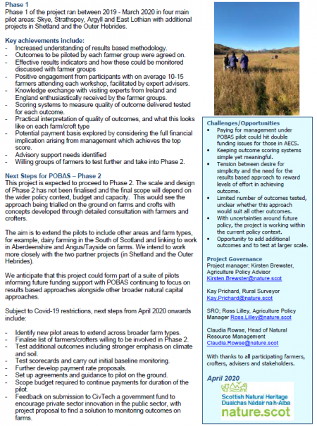 This project is expected to proceed to Phase 2. The scale and design of Phase 2 has not been finalised and the final scope will depend on the wider policy context, budget and capacity. This would see the approach being trialled on the ground on farms and crofts with concepts developed through detailed consultation with farmers and crofters.
