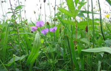 The rare purple-flowered Marsh pea flourishes on the meadows of Shannon Callows. It relies on the annual mowing of the meadows by the farmers to prevent scrub from growing over the meadows and to prevent strong, competitive plants from becoming dominant.
